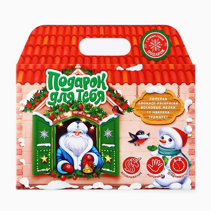 Подарочный набор новогодний блокнот-раскраска, трафареты, наклейки и восковые мелки «Подарок для тебя»