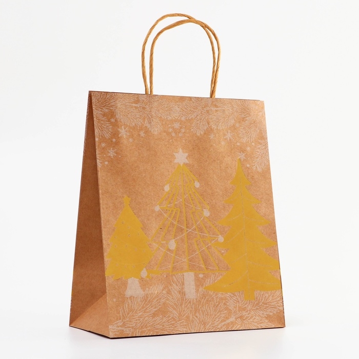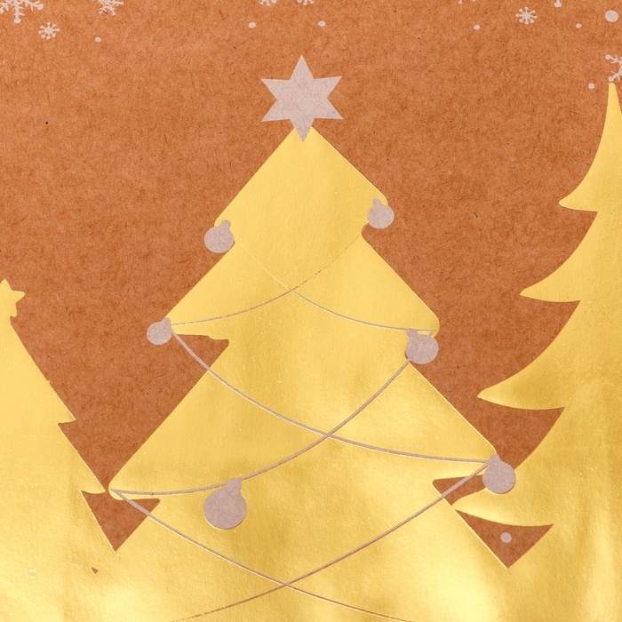Пакет крафт с золотым тиснением, круглая ручка, "Рожденственский лес" 33 х 25 х 12 см, 120 г 10574