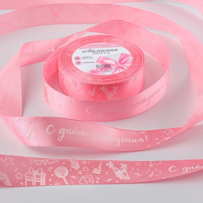 Лента атласная «С Днём Рождения», 25 мм × 23 ± 1 м, цвет розовый №147