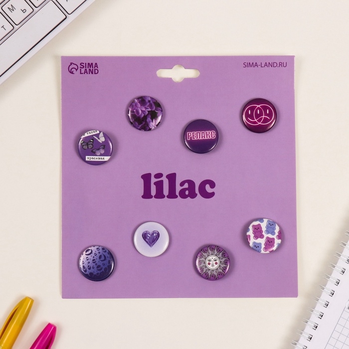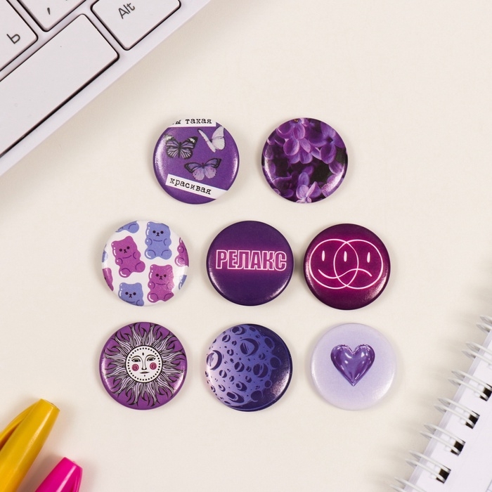Значки закатные набор 8 шт d=25 мм "Сиреневые" 16,5х17 см