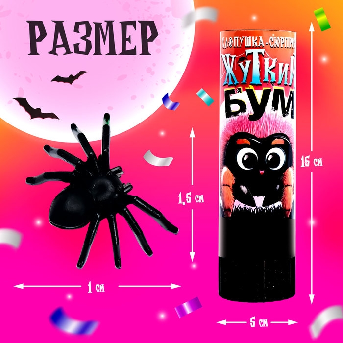 Хлопушка-сюрприз «Жуткий бум» — это идеальный атрибут для создания пугающей атмосферы на вечеринке по случаю Хэллоуина. Изделие размером 5 × 15 см наполнено цветной фольгой и маленькими паучками размером 1 × 1,5 см. Лёгкий и безопасный механизм активации позволяет использовать хлопушку в помещении и на улице.