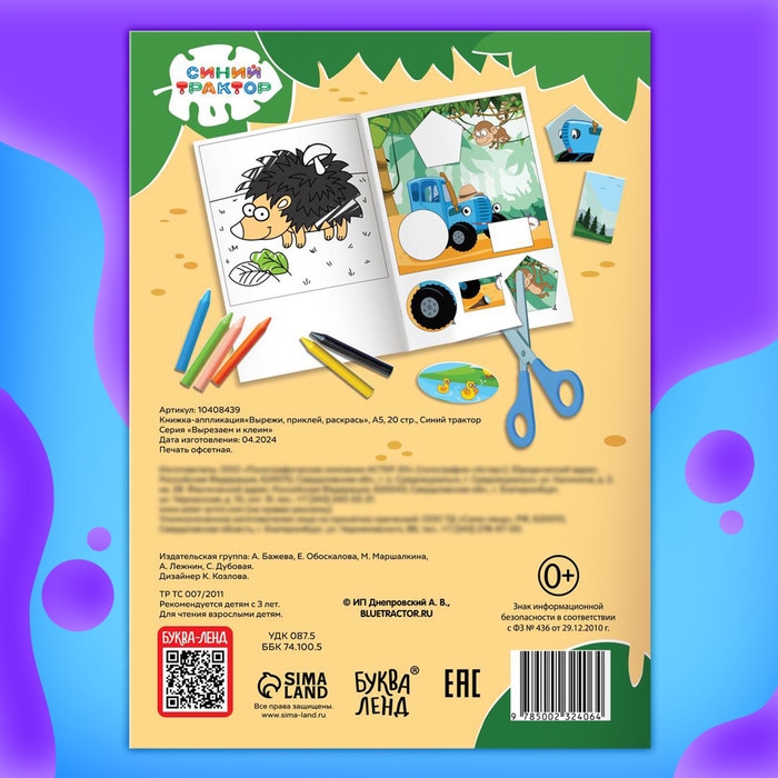 Книжка-аппликация «Вырежи, приклей, раскрась», А5, 20 стр., Синий трактор