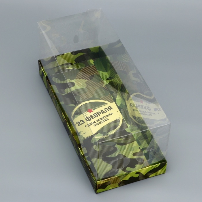 - Прозрачная крышка позволяет эффектно продемонстрировать содержимое, а тематический дизайн, посвященный Дню защитника Отечества, делает упаковку отличным выбором для подарка.