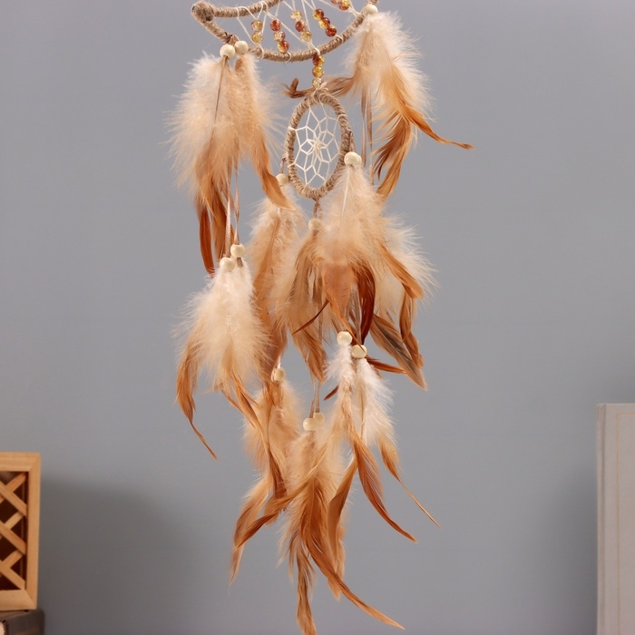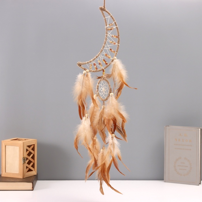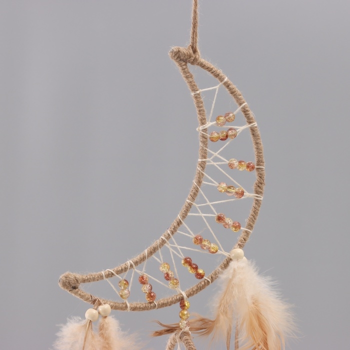 Ловец снов "Месяц" бежевый с кольцом и перьями 16х55 см