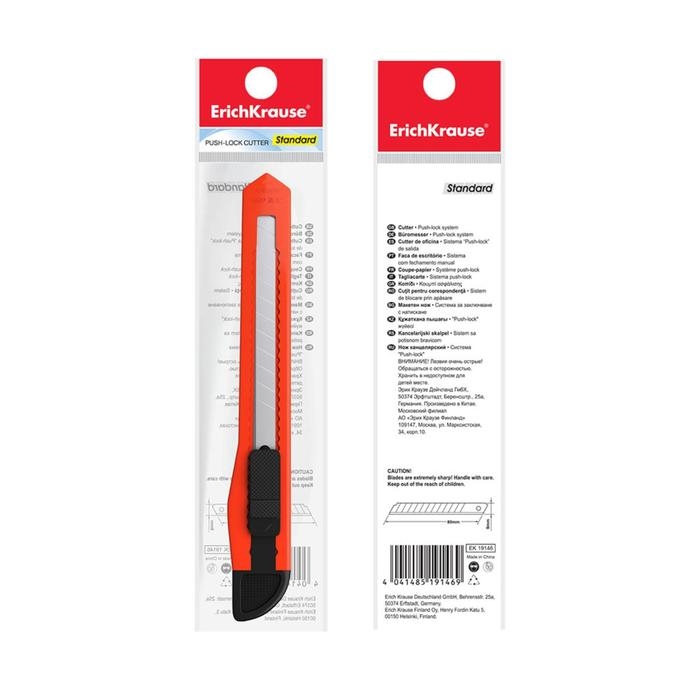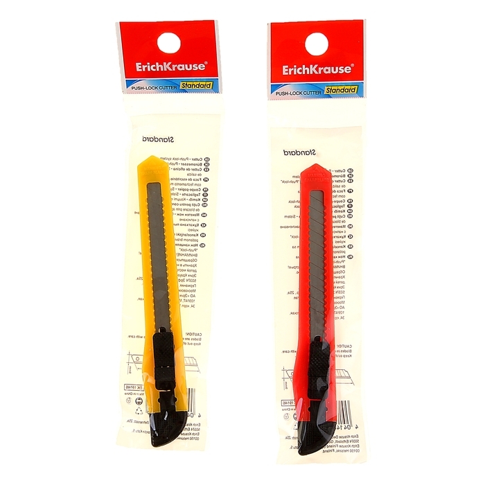 Нож канцелярский 9 мм, Erich Krause STANDARD, с системой фиксации лезвия push-lock и насадкой для безопасного отделения сегмента лезвия, МИКС