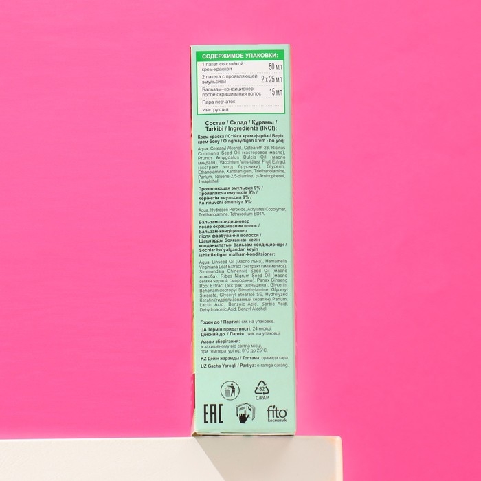 Крем-краска: Aqua, Cetearyl Alcohol, Ceteareth-23, Ricinus Communis Seed Oil (касторвое масло), Prunus Amygdalus Dulcis Oil (масло миндаля), Vaccinium Vitis-idaea Fruit Extract (экстракт ягод брусники), Glycerin, Ethanolamine, Xanthan gum, Triethanolamine, Parfum, Toluene-2,5-diamine, p- Aminophenol, 1-naphthol.