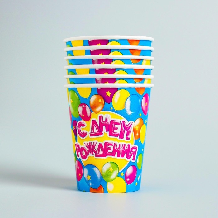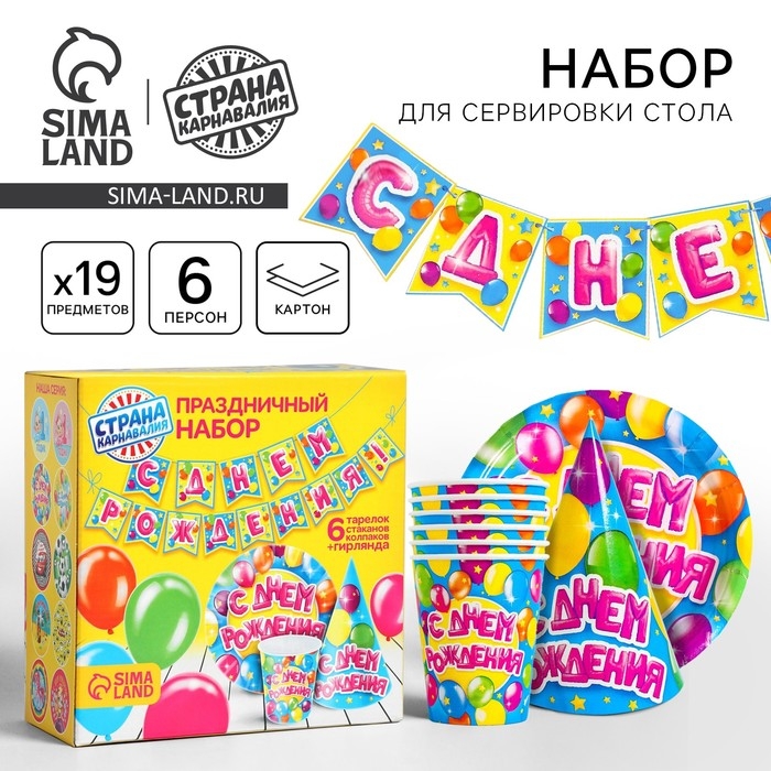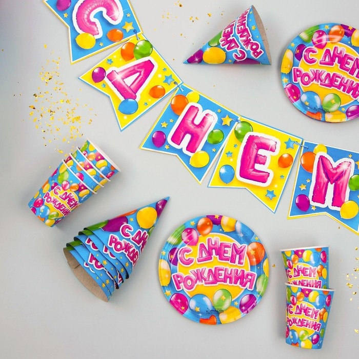 Набор бумажной посуды одноразовый С днём рождения», 6 тарелок, 6 стаканов, 6 колпаков, 1 гирлянда