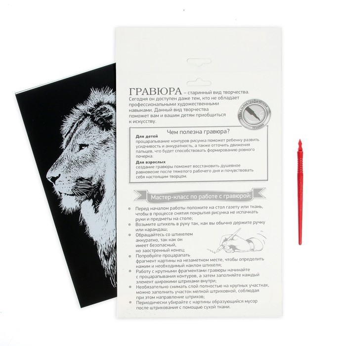 Гравюра представляет собой многослойное панно, покрытое чёрной краской, на которое нанесён контур рисунка. С помощью особого скребка (штихеля), который входит в набор, путём процарапывания и создается гравюра. Новая серия с уникальным дизайном порадует вас разнообразием рисунков.