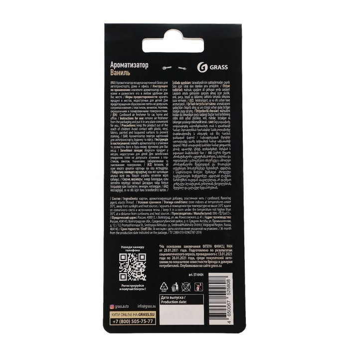 Ароматизатор Grass с ароматом ванили представляет собой компактный картонный подвесной блок с перфорированной поверхностью. Он предназначен для установки в автомобиле, офисе или любом другом помещении, чтобы создать приятную атмосферу и наполнить воздух нежным ароматом ванили.