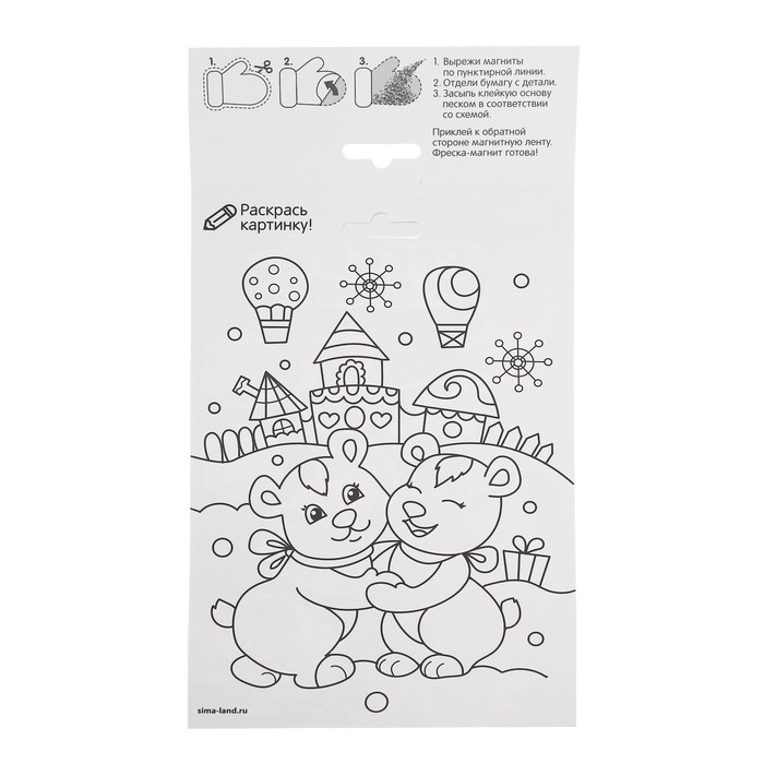 Фреска песком — увлекательный вид творчества, который понравится ребёнку. Клеевая основа защищена специальным слоем бумаги, куда нанесены прорезные контуры. Каждый цвет находится в своей зоне: отделяйте верхний слой с помощью стеки и засыпайте элементы песком.
