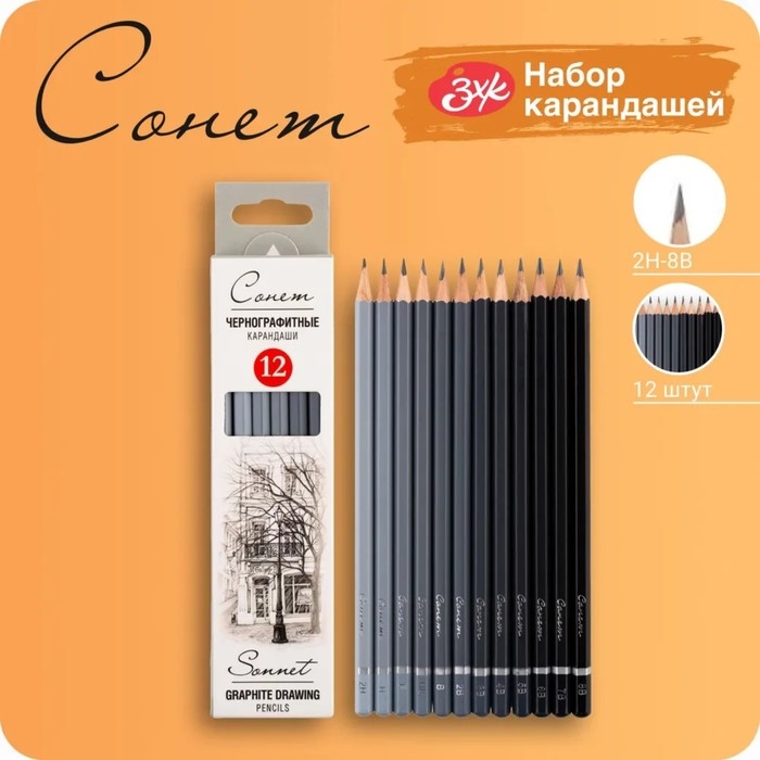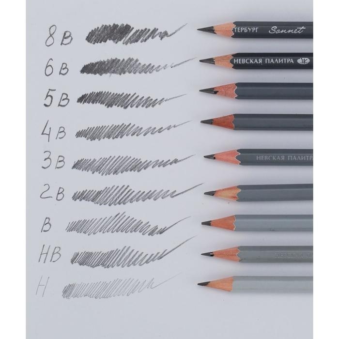 Карандаши "Сонет" идеальны для создания набросков, чертежей и других графических работ любой сложности. Изготовлены из высококачественного прочного графита в шестигранном корпусе из древесины липы диаметром 6,9 мм. Оптимальная толщина стержня позволяет создавать разнообразные эффекты. Карандаши отличаются гладкостью нанесения штриха, легко затачиваются. В набор входят карандаши разной степени твердости от 2Н до 8В. Цветовая градация в дизайне корпуса карандашей обеспечивает комфортную работу.