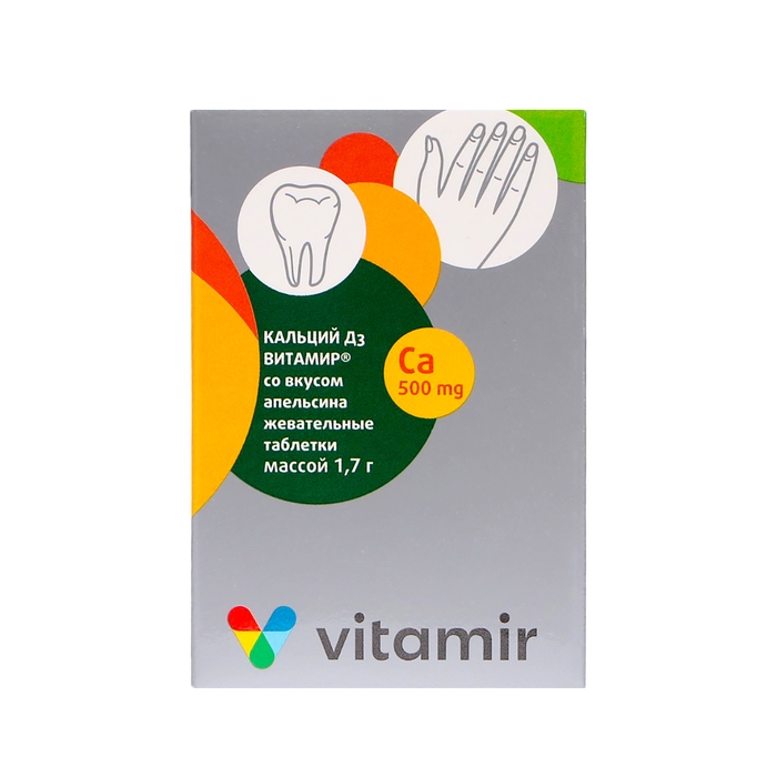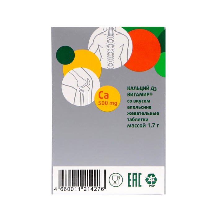 БАД. Дополнительный источник кальция, витамина Д3 таб. (кальция карбонат – 1,25 г (эквивалентно элементарному кальцию 500 мг), Витамин Д3 (холекальциферол) – 2,5 мкг (100 МЕ).
