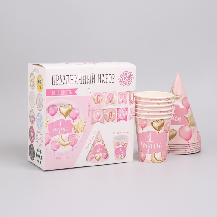 Набор бумажной посуды одноразовый 1 годик, девочки. Шары», 6 тарелок, 6 стаканов, 6 колпаков, 1 гирлянда