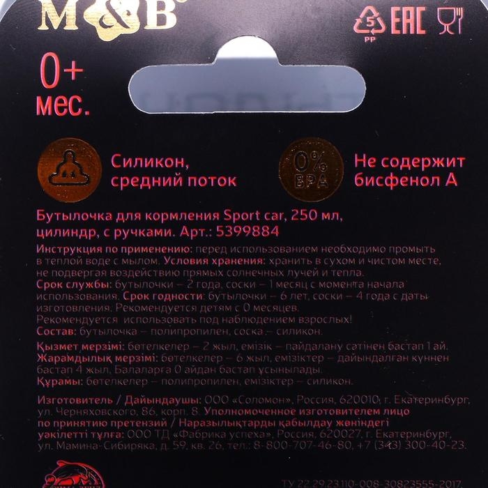Бутылочка для кормления Sport car, классическое горло, от 0 мес, 250 мл., цилиндр, с ручками