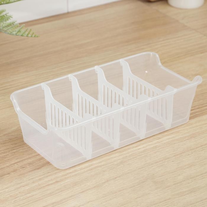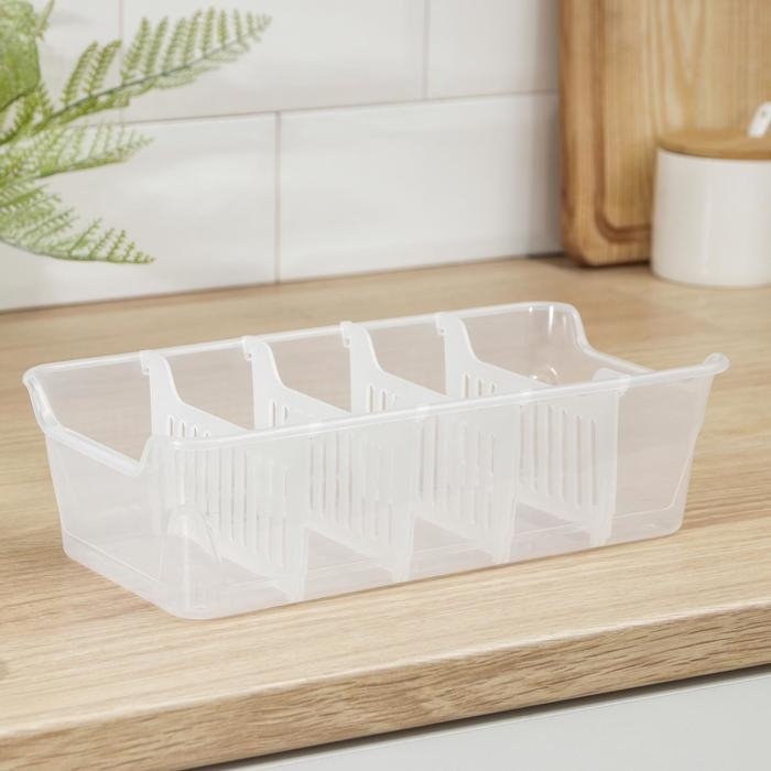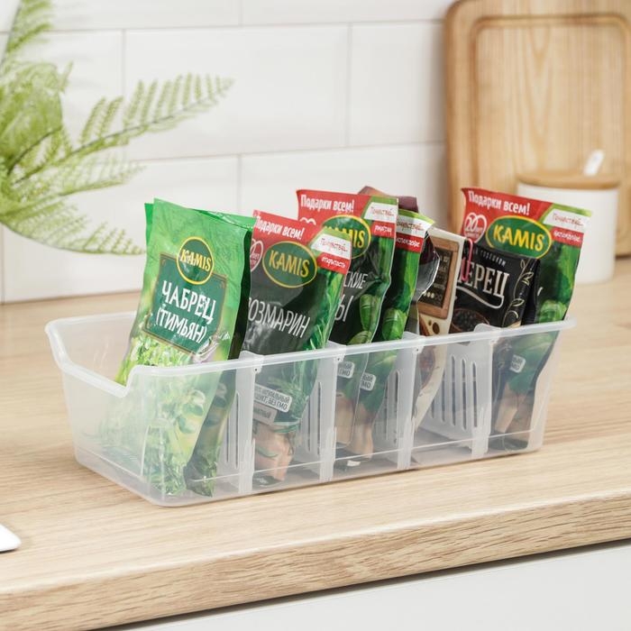 Органайзер для хранения специй, приправ и пряностей позволяет отсортировать пакетики со специями. Благодаря этому легко найти искомый пакет и поддерживать порядок в кухонном шкафу. Стенки лотка снабжены высокими бортиками. Практичный органайзер пригодится в любом хозяйстве и поможет аккуратно хранить все приправы в одном месте. Размер корзинки выверен под стандартный размер пакетика со специями, которые в большинстве своем представлены на полках магазинов, а потому отделения идеально подходят для их устойчивого хранения. Одновременно такой органайзер не занимает много места и поместится на любой кухонной полочке.