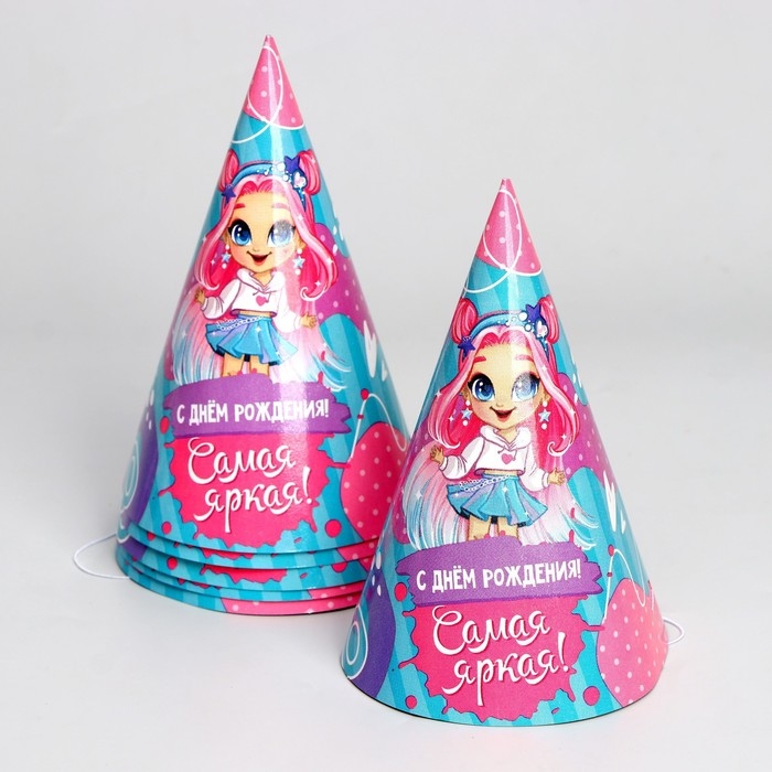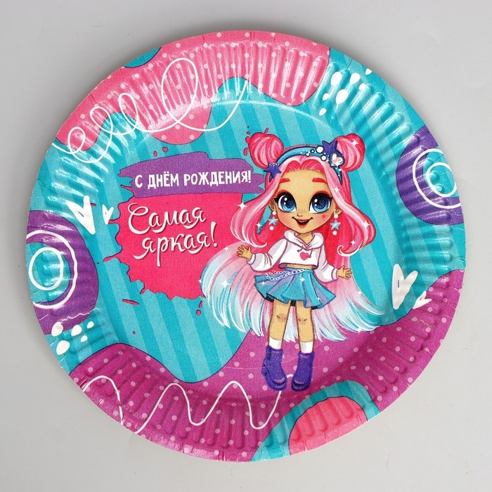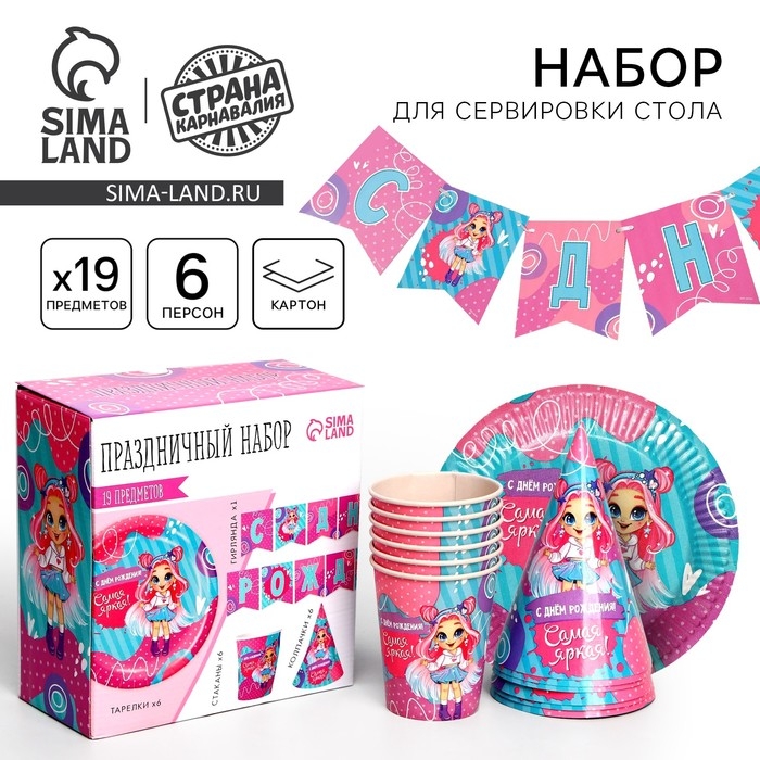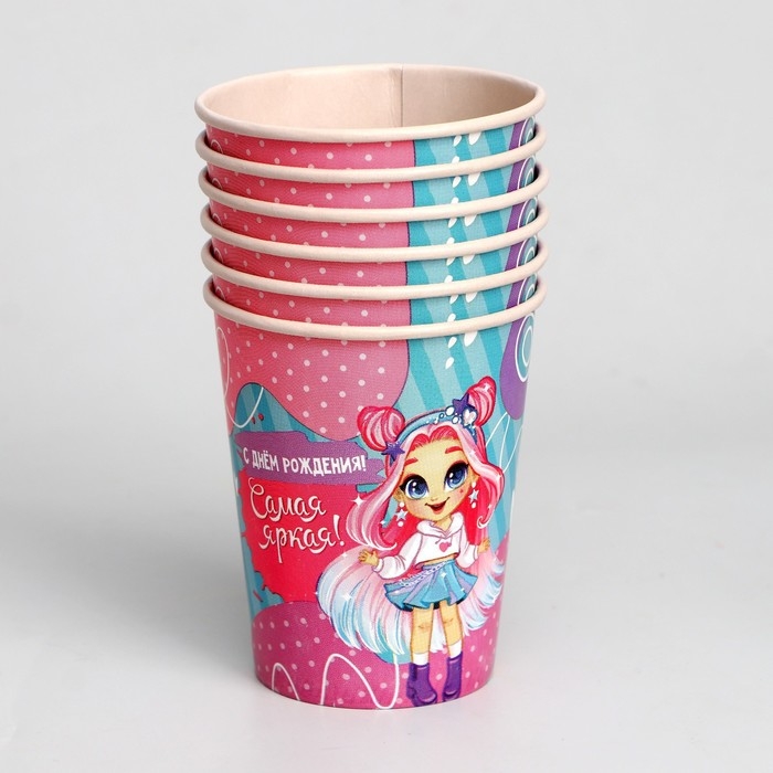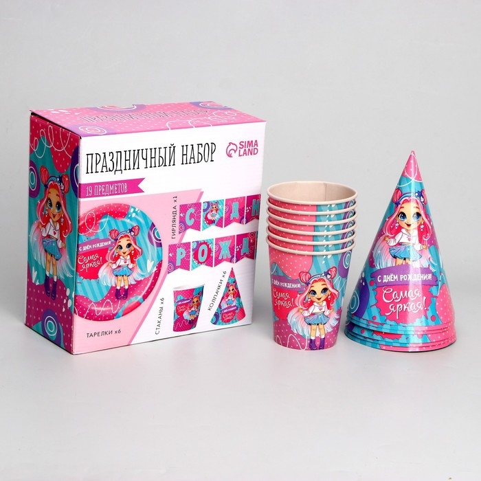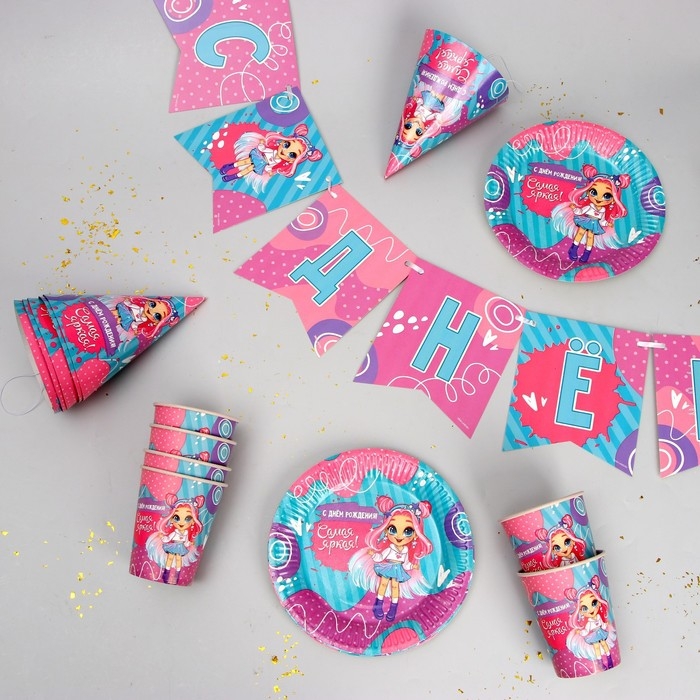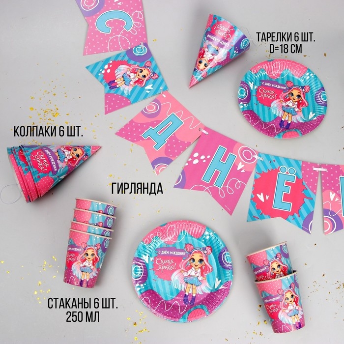 Набор бумажной посуды одноразовый С Днём Рождения», самая яркая, 6 тарелок, 6 стаканов, 6 колпаков