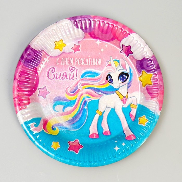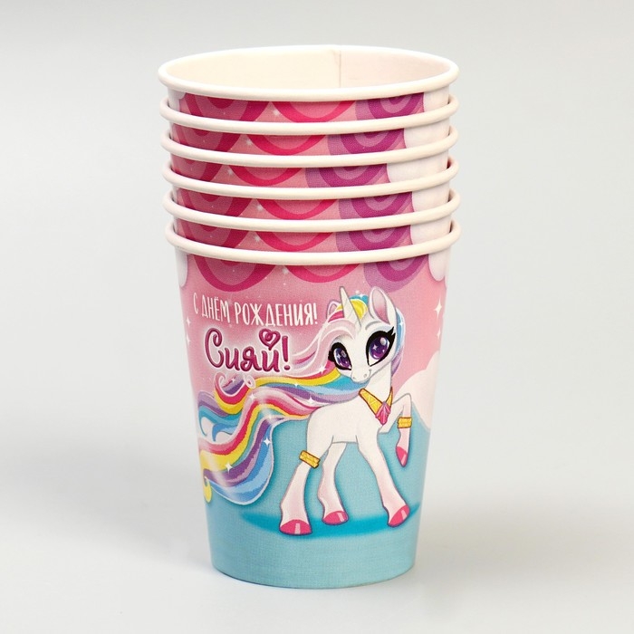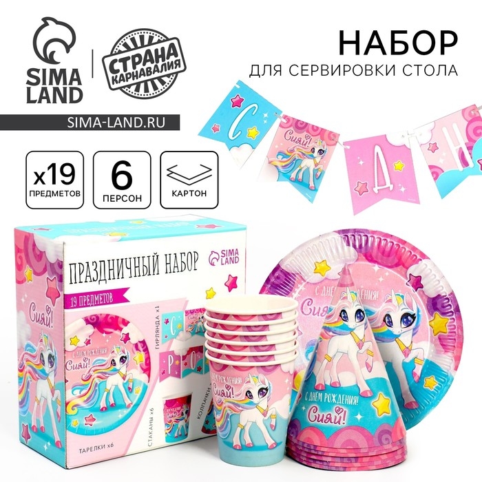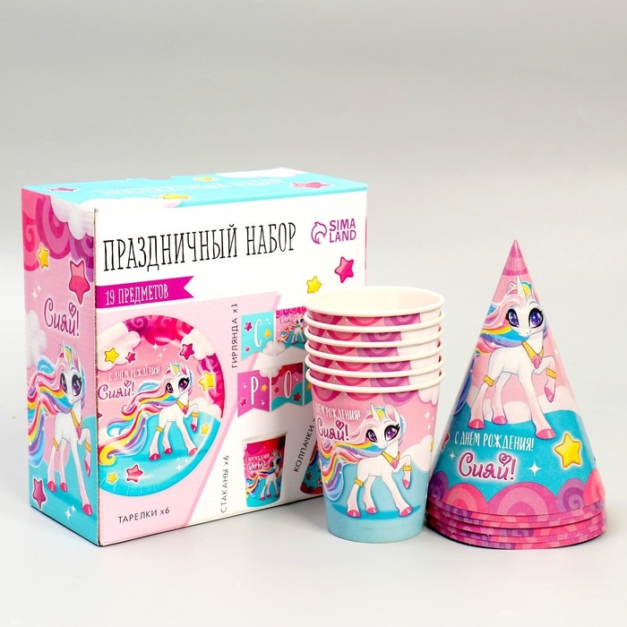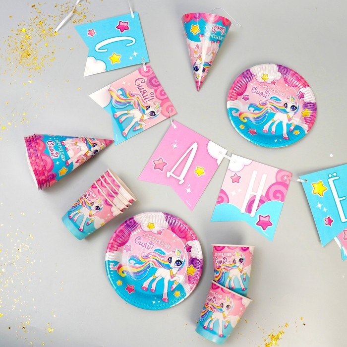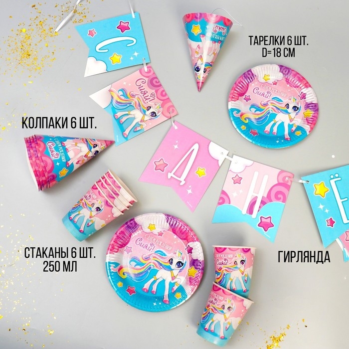Набор бумажной посуды одноразовый С днём рождения», пони: 6 тарелок, 6 стаканов, 6 колпаков, 1 гирлянда
