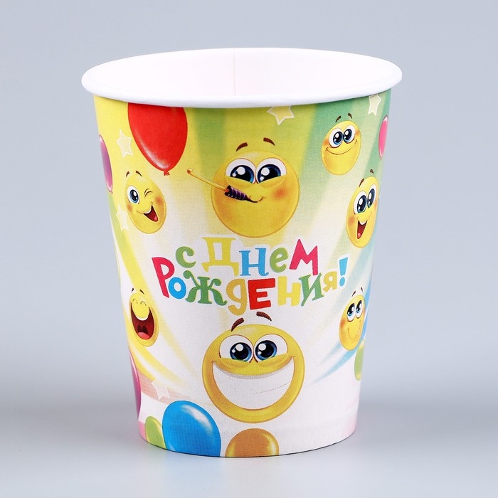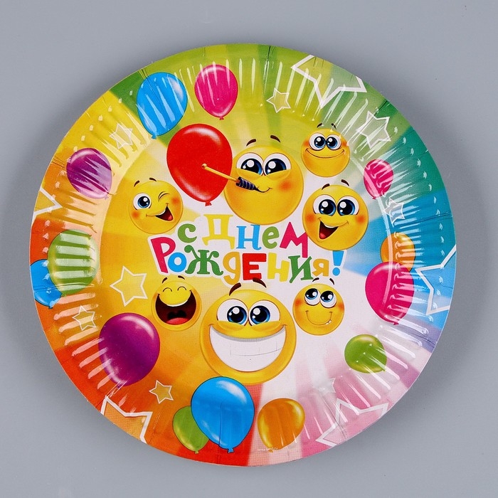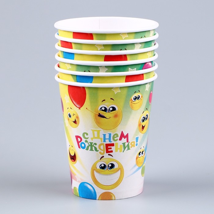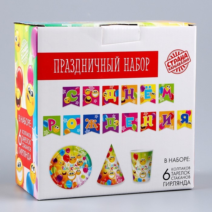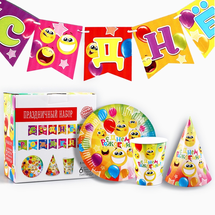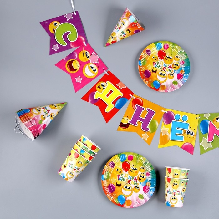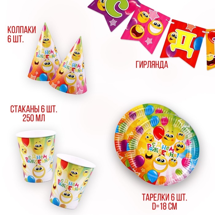 Набор бумажной посуды одноразовый Смайлы»: 6 тарелок, 1 гирлянда, 6 стаканов, 6 колпаков