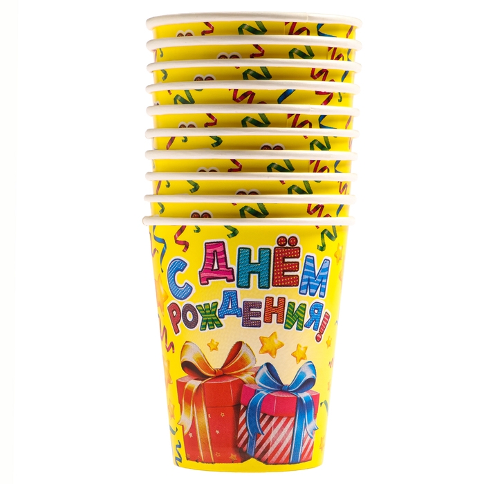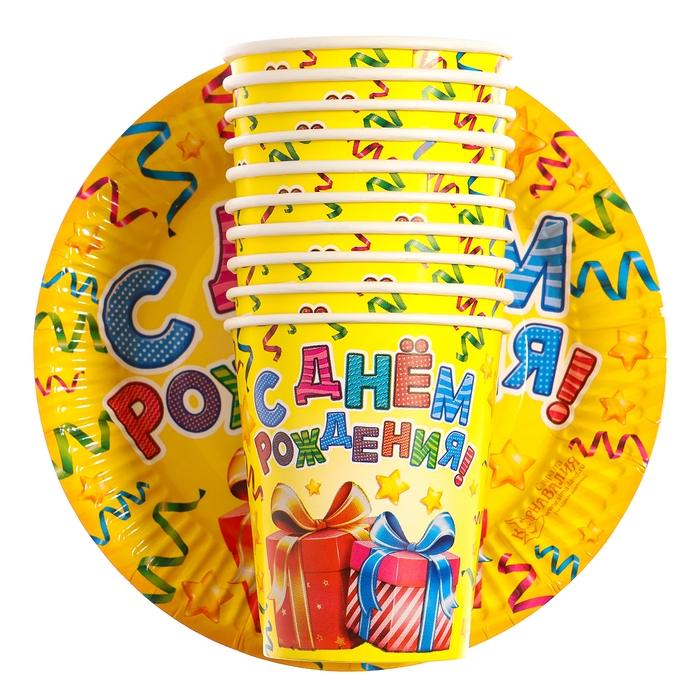Набор бумажной посуды "С днём рождения", подарки и серпантин, 10 стаканов, 10 тарелок