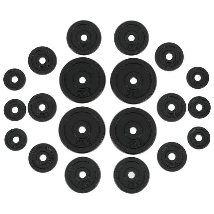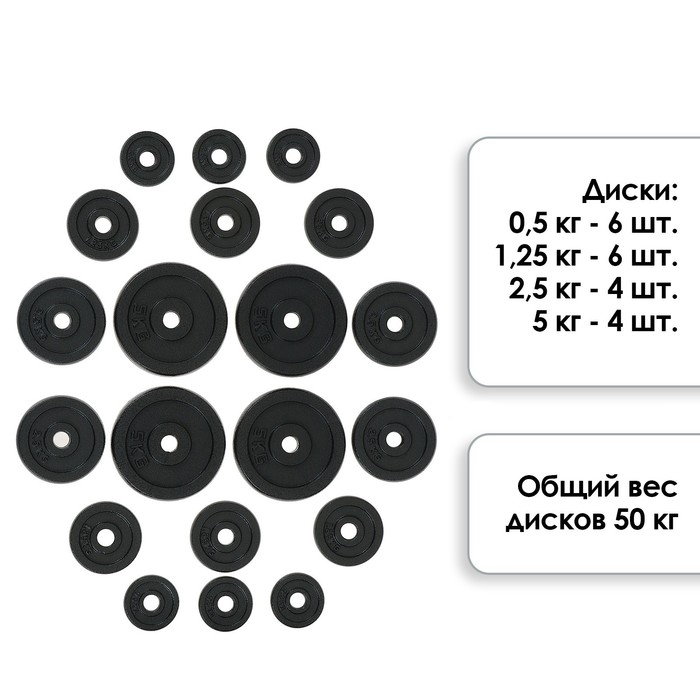 - Диски: 0,5 кг - 6 шт., 1,25 кг - 6 шт., 2,5 кг - 4 шт., 5 кг - 4 шт.