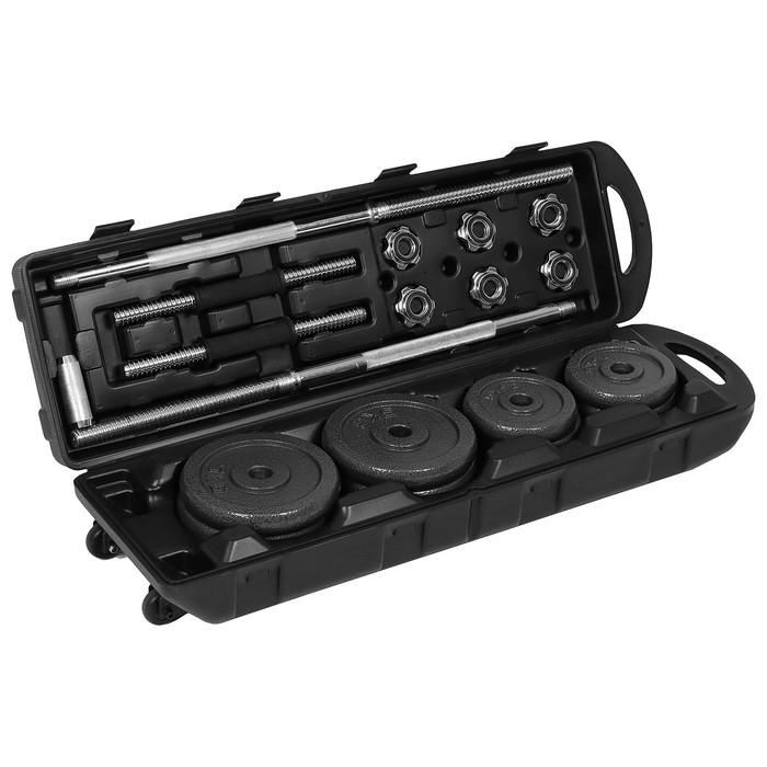 Набор подходит для тренировок в спортивном зале и дома. Удобно хранить и транспортировать благодаря специальному кейсу на колёсах, который входит в комплект.