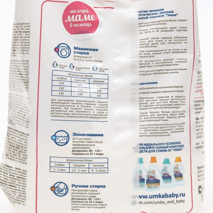 Стиральный детский порошок «Умка» разработан на основе натурального мыла, подходит для стирки детского белья с первых дней жизни.