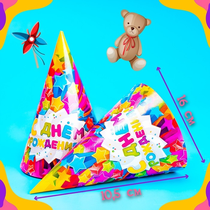 Колпак бумажный «С днём рождения!», звёзды, набор 6 шт., 16 см