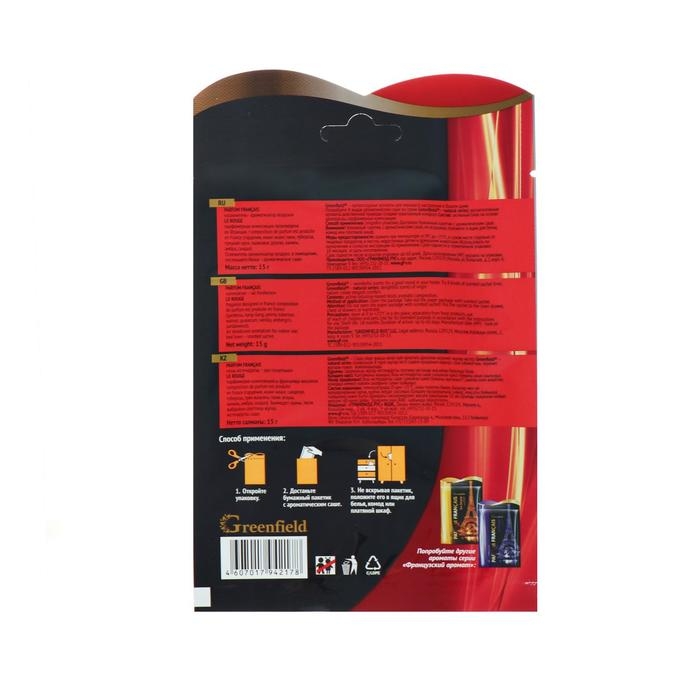 Ароматизатор воздуха Гринфилд Parfum Francais. Этот освежитель воздуха в форме саше отлично пахнет, придает натуральную свежесть в жилом и офисном помещении, платяном и бельевом шкафах, ванных комнатах, санузлах, салонах автомобилей. Романтический аромат подойдет для любителей различных ароматов, ведь в нем таятся бесподобные ноты французских классических запахов. Этот аромат способен создавать хорошее настроение в Вашем доме.