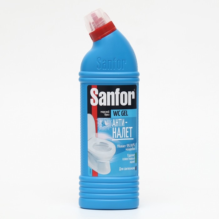 Sanfor WC gel Морской бриз станет незаменимым помощником при очистке унитаза. Активная формула разрушает мочевой камень, налет и ржавчину, обладает антибактериальным действием. Гелеобразное средство очищает также жировые пятна, плесень и мыльные подтеки. Густая формула не растекается с наклонных поверхностей, обеспечивая чистоту и блеск даже в труднодоступных местах. Дарит свежий запах сантехнике, подходит для дезинфекции туалетов домашних питомцев.