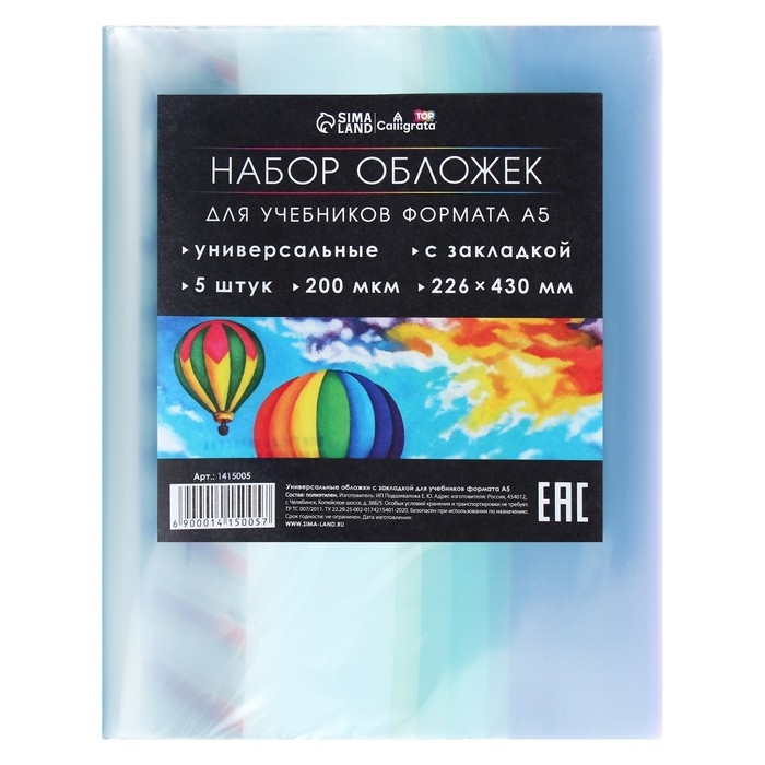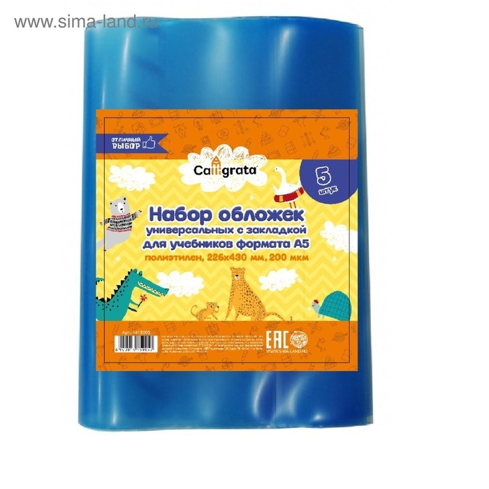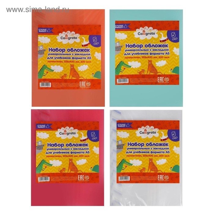 Набор обложек ПЭ 5 штук, 226 х 430 мм, 200 мкм, для учебников формата А5, универсальная, с закладкой
