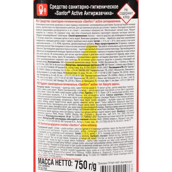Средство санитарно-гигиеническое "Sanfor active", Антиржавчина, 750 мл