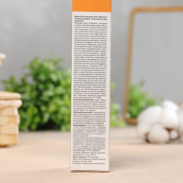 Состав: Вода, Глицерин, Диметикон М 350, Циклометикон DC 345, Масло подсолнечное, Myritol 318, Кутина GMS / Кутина GMS V, Спирт цетеариловый, Arlamol , Стеариновая кислота, Воск эмульсионный , Пропиленгликоль, Микрокар DMP / Кемабен DMP, Триэтаноламин, Изигель DO / Карбопол Ультрез-10, Кислота молочная, Трилон Б , Катон CG / Микрокар IT/ Шаромикс MCII, Отдушка Compo №3, ЭМ полыни, Гидролизат коллагена, ЭМ зверобоя, ЭПГ алоэ, ЭПГ женьшеня, Шунгит, Масло кедровое, Яд пчелиный сырец, Мумие, Витанол.