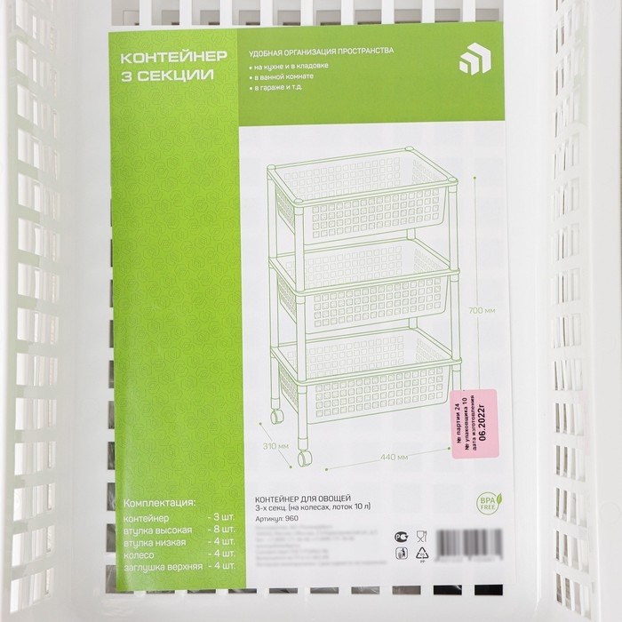 Прочный пластмассовый корпус стеллажа выдерживает высокую нагрузку, а колёсики обеспечивают мобильность изделия. Удобная, компактная, но в то же время вместительная, она прекрасно впишется в пространство любого помещения. Изделие можно расположить на кухне, в прихожей, ванной, гостиной, детской или спальне.