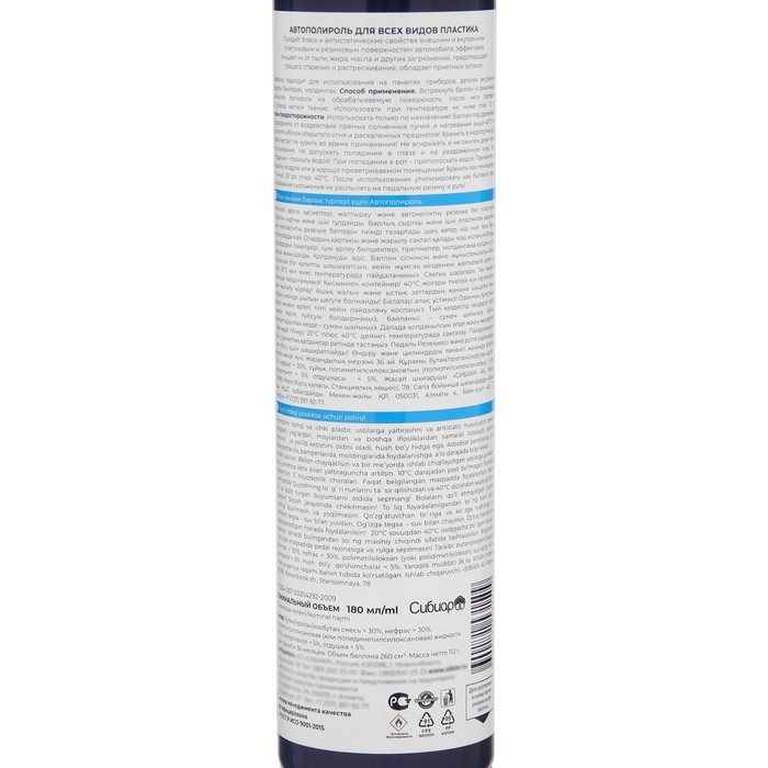 Применяется для полировки и придания глянцевого блеска пластиковым, кожаным и резиновым элементам отделки салона автомобиля. Может использоваться как полироль для шин. Препятствует появлению жирных пятен и оседанию пыли. Обладает приятным ароматом Антитабак. Для всех видов пластика.