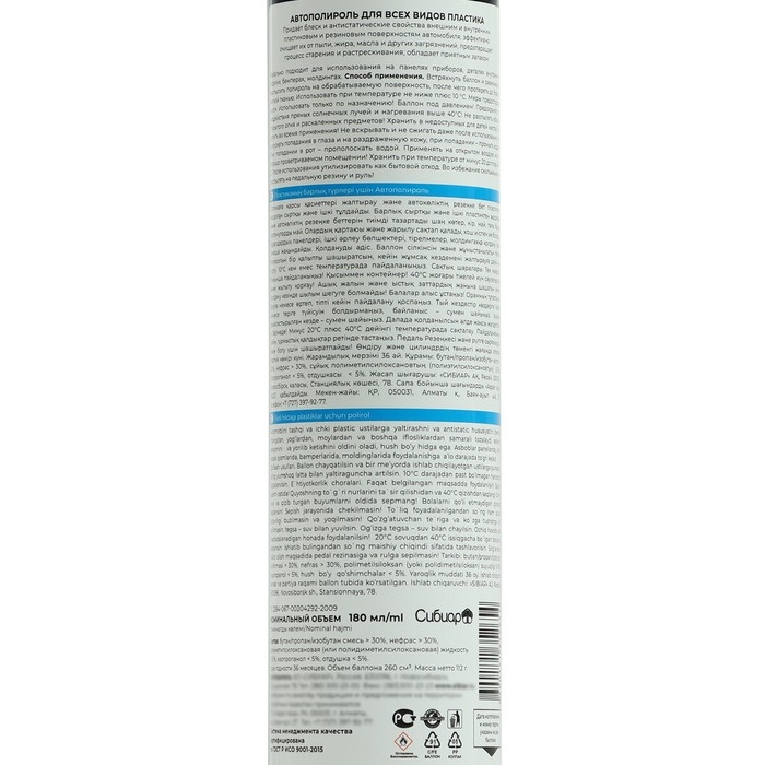- Применяется для полировки и придания глянцевого блеска пластиковым, кожаным и резиновым элементам отделки салона автомобиля.