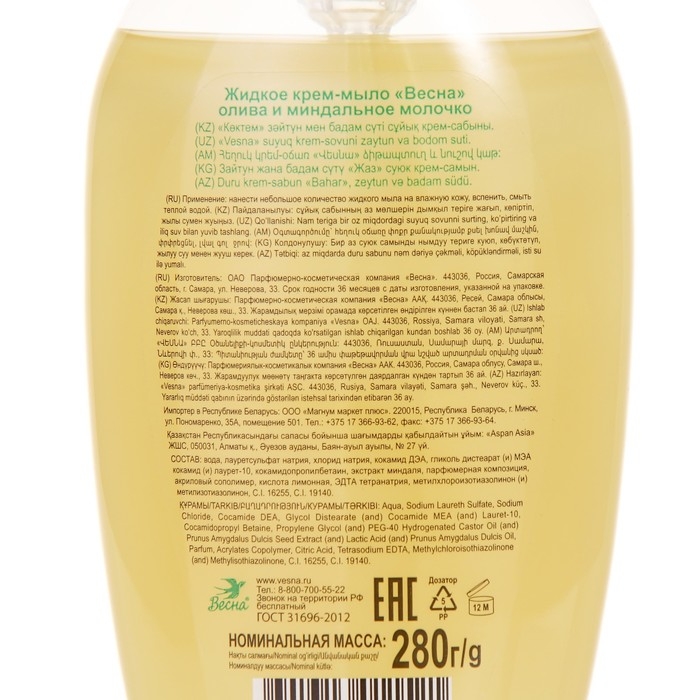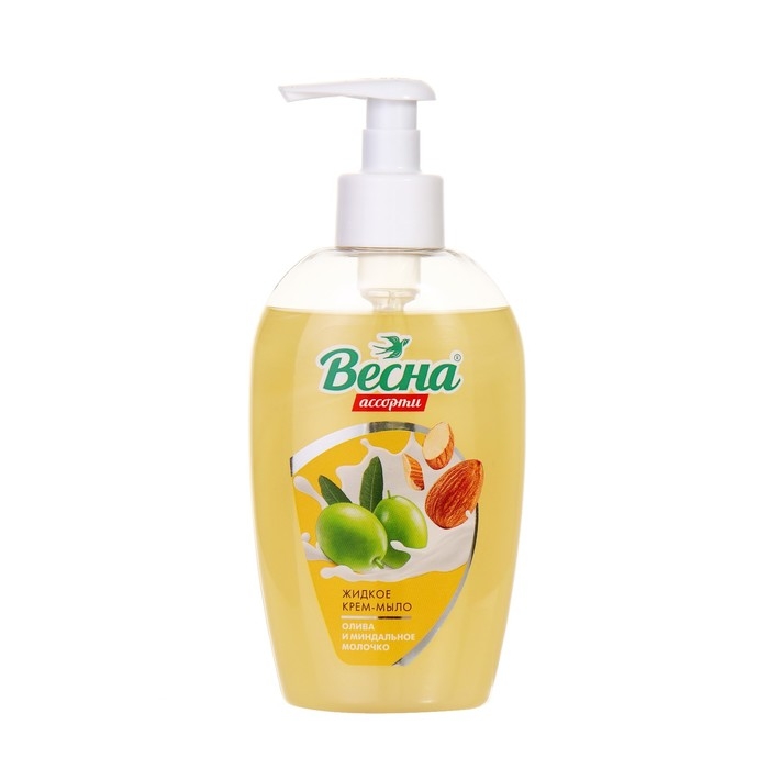 Крем-мыло жидкое Олива Миндальное молочко экономичный вариант жидкого семейного крем-мыла. Жидкое крем-мыло это здоровье Вашей кожи. Жидкое крем-мыло не сушит кожу, бережно очищает ее и идеально подходит для всей семьи. Крем-мыло подходит для повседневного использования. Крем-мыло Весна Олива и миндальное молочко очищает, хорошо пенится, быстро смывается. Крем-мыло обладает антисептическими свойствами.