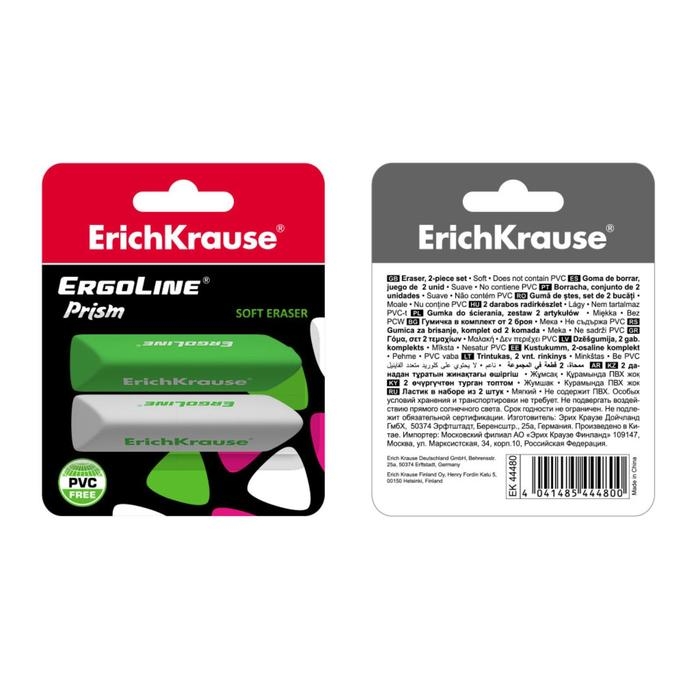 Набор ластиков 2 штуки ErgoLine Prism, мягкий, из гипоаллергенного материала термопластичной резины (TPR) с пониженным образованием крошек (Dust free), блистер