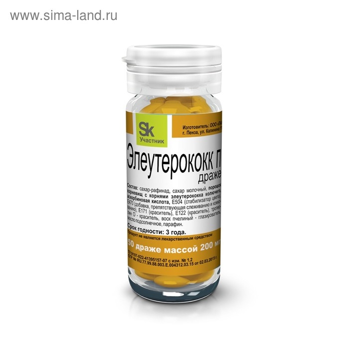 Состав: сахар-рафинад, сахар молочный, порошок корневищ с корнями элеутерококка колючего, аскорбиновая кислота, E504 (стабилизатор цвета E470 (добавка, препятствующая слеживанию и комкованию), Е171 (краситель), E122 (краситель), тропеолин О - краситель, воск пчелиный - глазирователь масло подсолнечное, парафин.