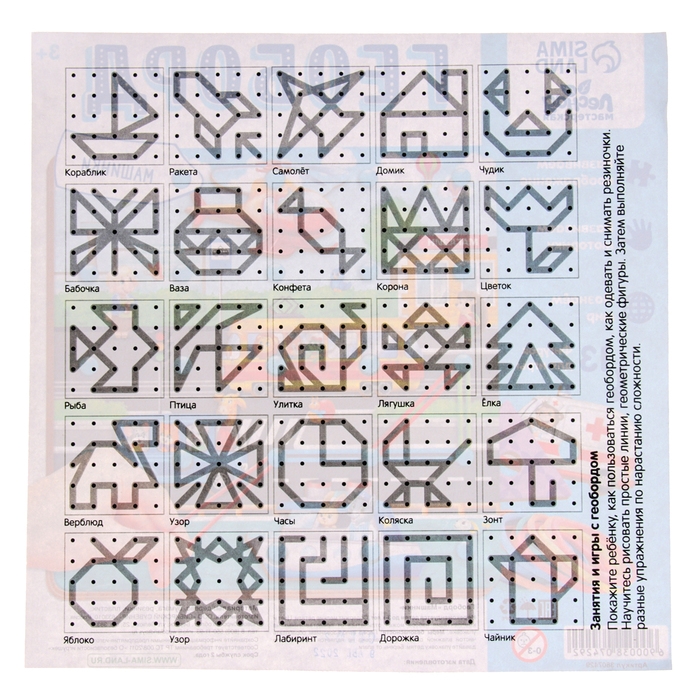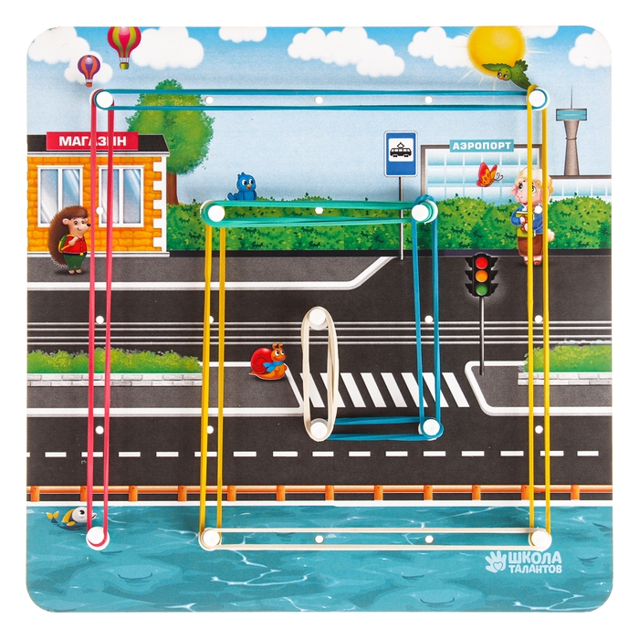 Геоборд представляет собой плоское поле (обычно в форме квадрата или прямоугольника) с равноудалёнными друг от друга штырьками. Суть игры - создавать различные фигуры, надевая на штырьки резиночки. Сначала предложите малышу повторить схемы из набора, а затем попросите придумать историю и обыграть её с помощью резиночек на геоборде.