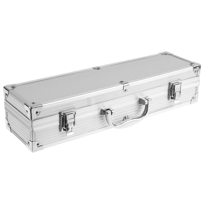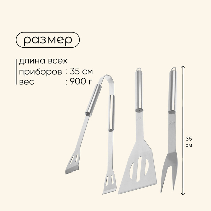 В набор входит всё необходимое для приготовления пищи на гриле или барбекю. В комплекте есть вилка для мяса, лопатка, щипцы и кейс для хранения и переноски. Приборы выполнены из нержавеющей стали.
