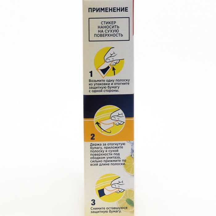 Способ применения: надорвите пакетик, извлеките полоску и отогните бумажную полоску с одной из ее сторон. Держа за отогнутую бумажку, сильно прижмите полоску к внутренней сухой поверхности унитаза и разгладьте по краям. Снимите оставшуюся бумагу. Приклеивать только на сухую поверхность.