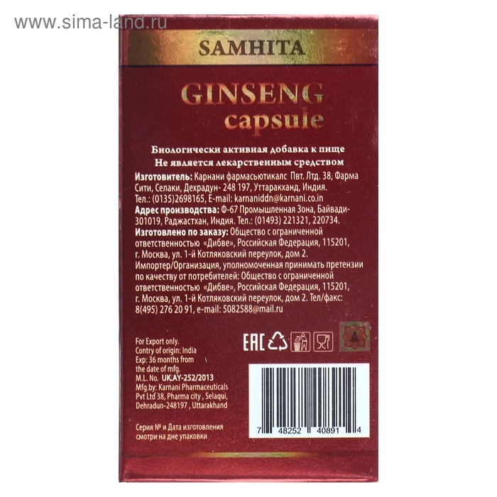 Капсулы «Самхита», аюрведические, женьшень, для здоровья сердца, энергии, улучшения мозговой деятельности, 30 штук
