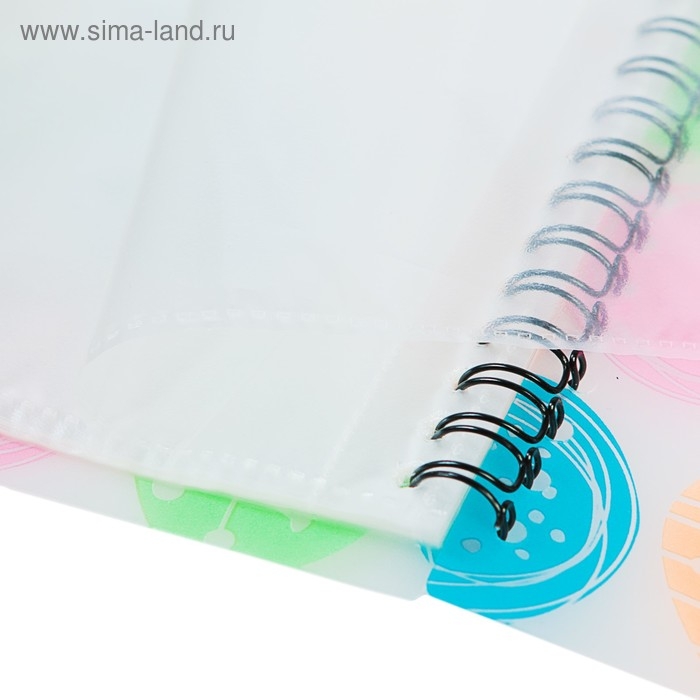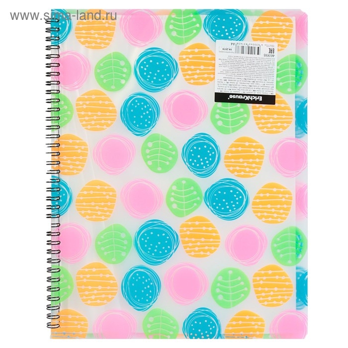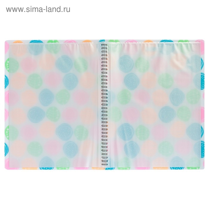 - Папка содержит 20 прозрачных листов-карманов, надежно скрепленных двойной евроспиралью.