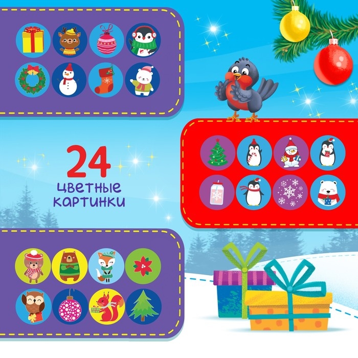В набор входят: проектор-фонарик, 3 слайда (24 цветные картинки) и 12 светящихся в темноте снежинок.