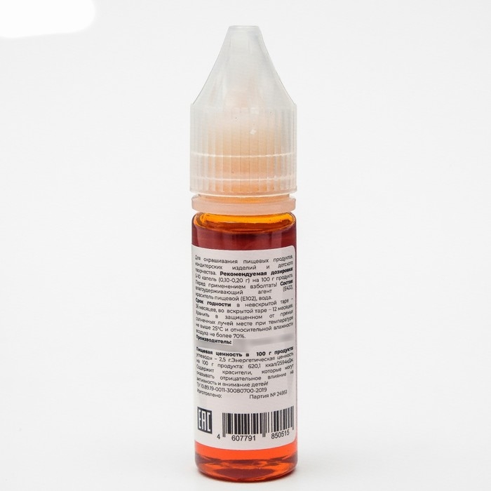 Область применения: для окрашивания продуктов питания и различных кондитерских изделий (теста, мастики, айсинга, марципана, крема и так далее), а также для детского творчества (мыловарение, слаймы).