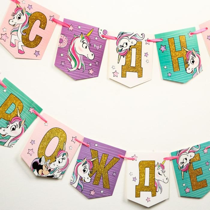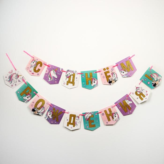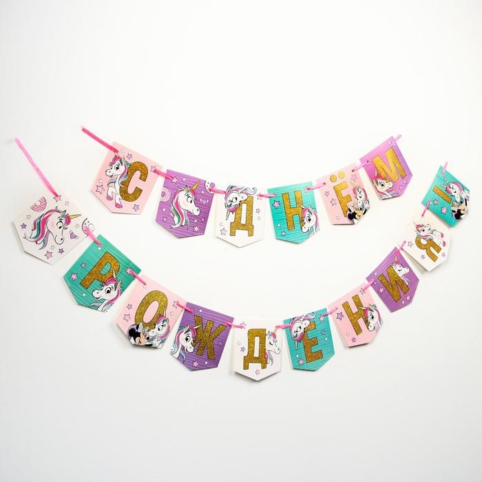 Гирлянда на ленте "С Днем Рождения!", длина 215 см, Минни Маус и Единорог
