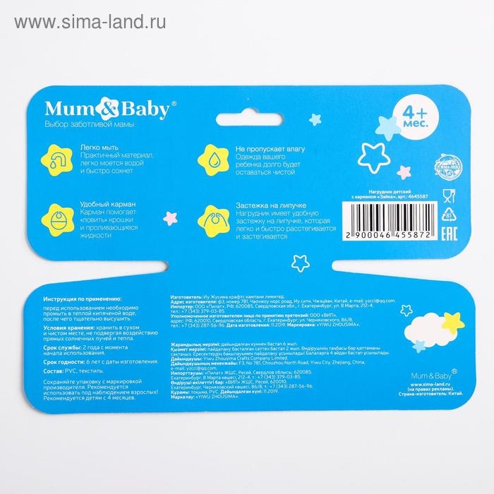Товар изготовлен из материалов, не содержащего токсичных веществ. После использования мойте тёплой мыльной водой. Нагрудник рекомендован для детей старше 4 месяцев.