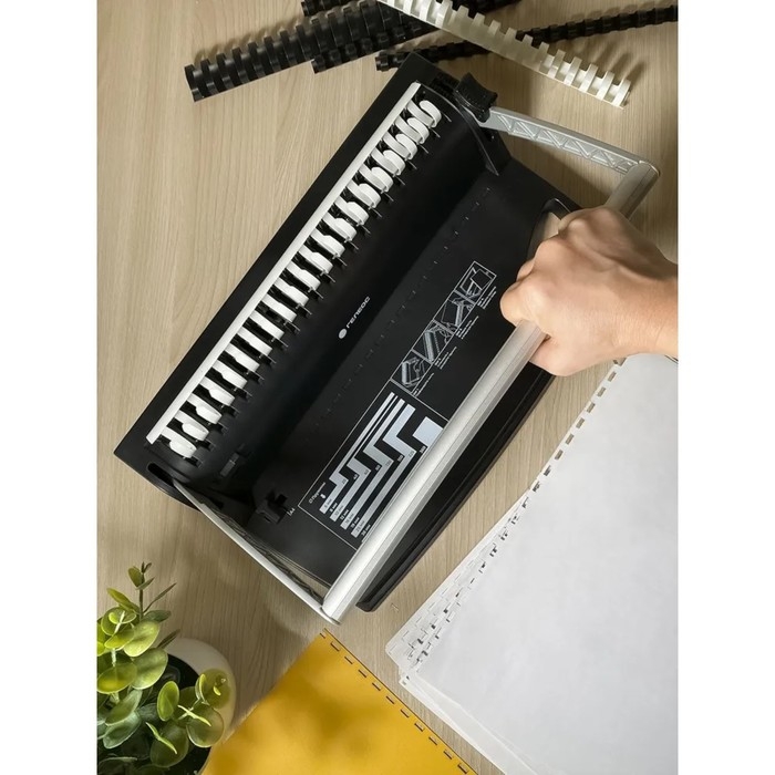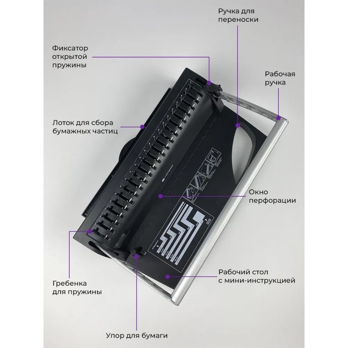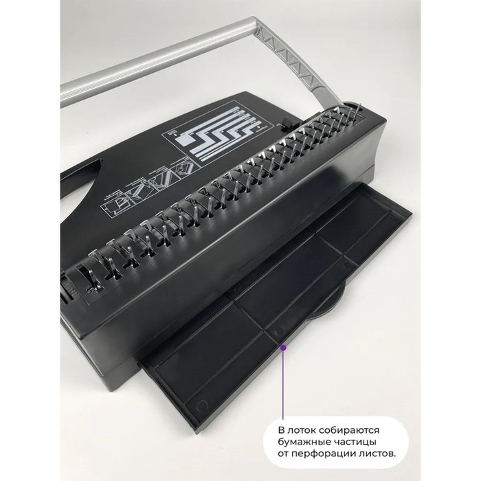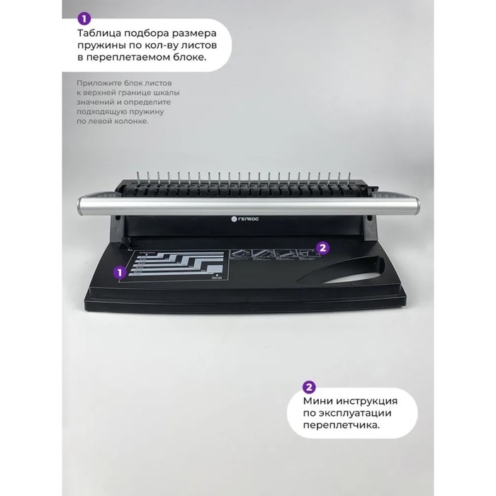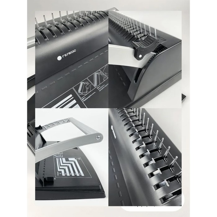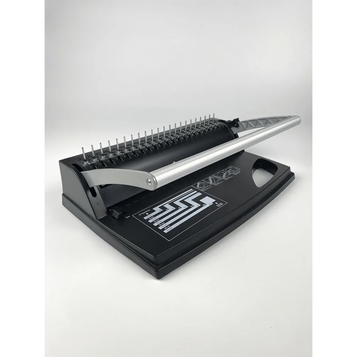 Лаконичный корпус переплетчика выполнен из темного матового пластика, а по обеим сторонам находятся серебристые вставки. На станине для удобства работы имеется упор для бумаги.