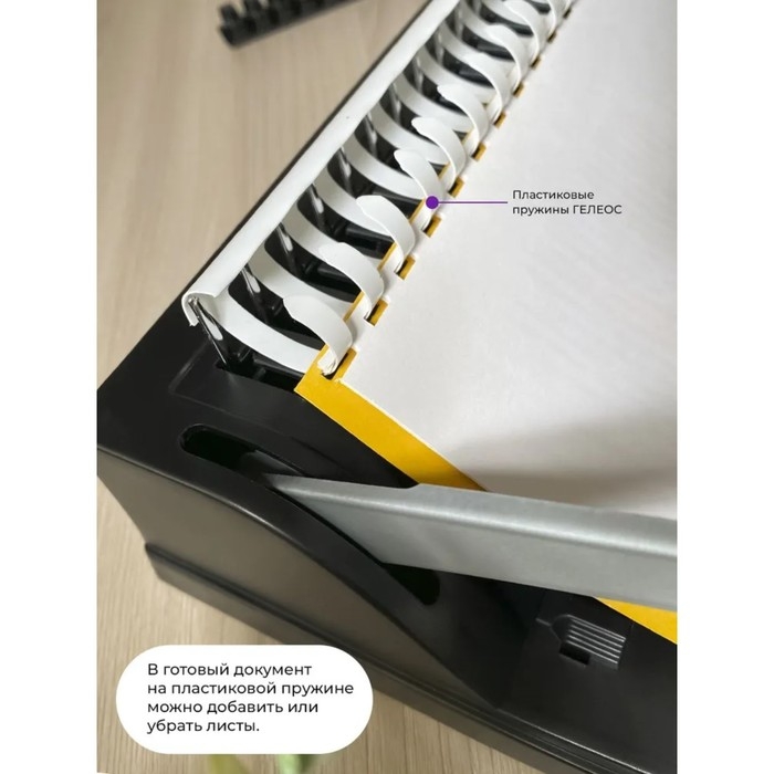 Дает возможность сделать практичный и экономичный переплет на пластиковую пружину диаметром до 19 мм, это блок объемом в 170 листов. Такой вид переплета позволяет свободно пользоваться оформленным материалом: раскрывать документ на любой градус, копировать, заменять, добавлять и убирать листы.