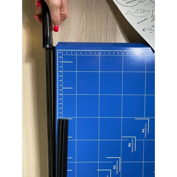 Сабельный резак с градуировкой рабочей поверхности позволяет работать с форматами А3 и меньше.